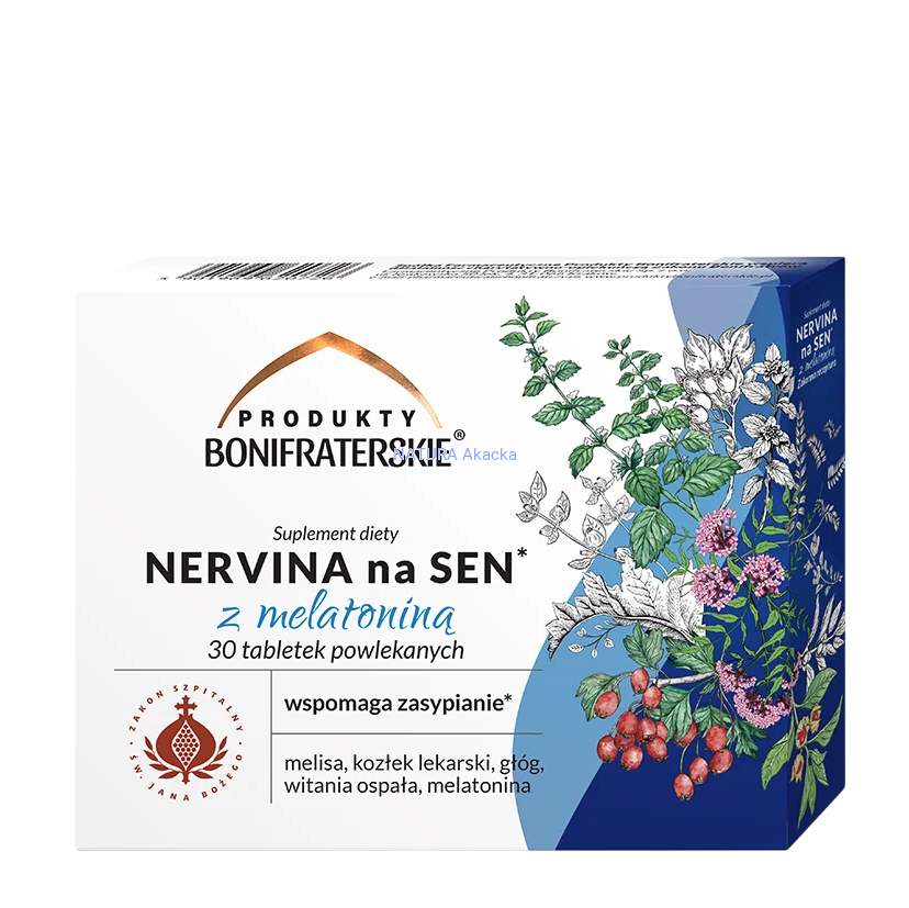 NERVINA na SEN* z melatoniną suplement diety to preparat oparty na zakonnej recepturze i doświadczeniu Braci Zakonu Bonifratrów. *Melatonina pomaga w skróceniu czasu potrzebnego na zaśnięcie. Korzystne działanie występuje w przypadku spożycia 1 mg melatoniny krótko przed pójściem spać.