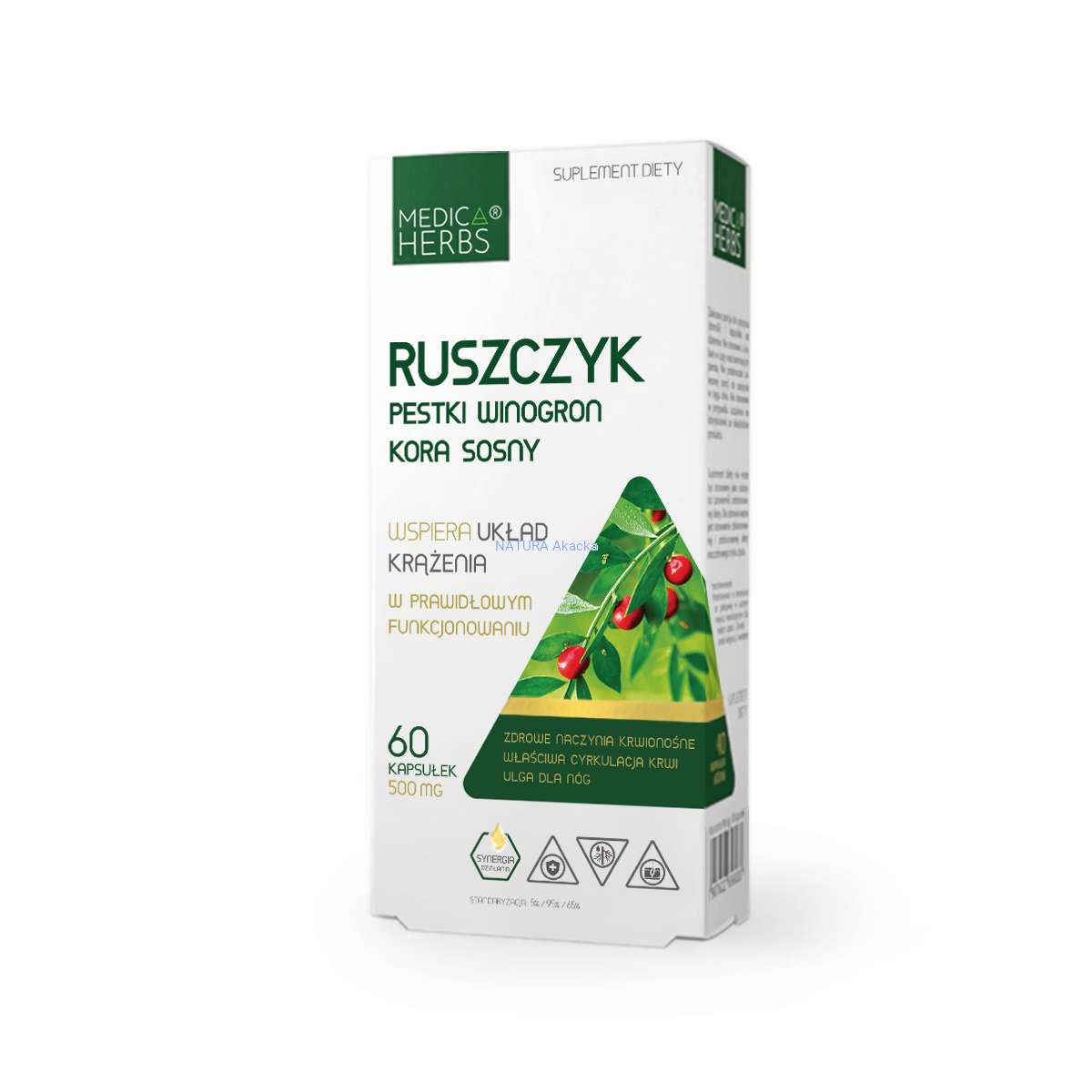 - Ruszczyk kolczasty, pestki winogron i kora sosny wspólnie wspierają prawidłowe funkcjonowanie naczyń krwionośnych oraz odpowiednią cyrkulację krwi. Ruszczyk wraz z pestkami winogron wspomaga właściwe krążenie żylne w nogach, dzięki czemu wspiera uczucie lekkości nóg. Dodatkowo pestki winogron przyczyniają się do zachowania zdrowego wyglądu skóry.